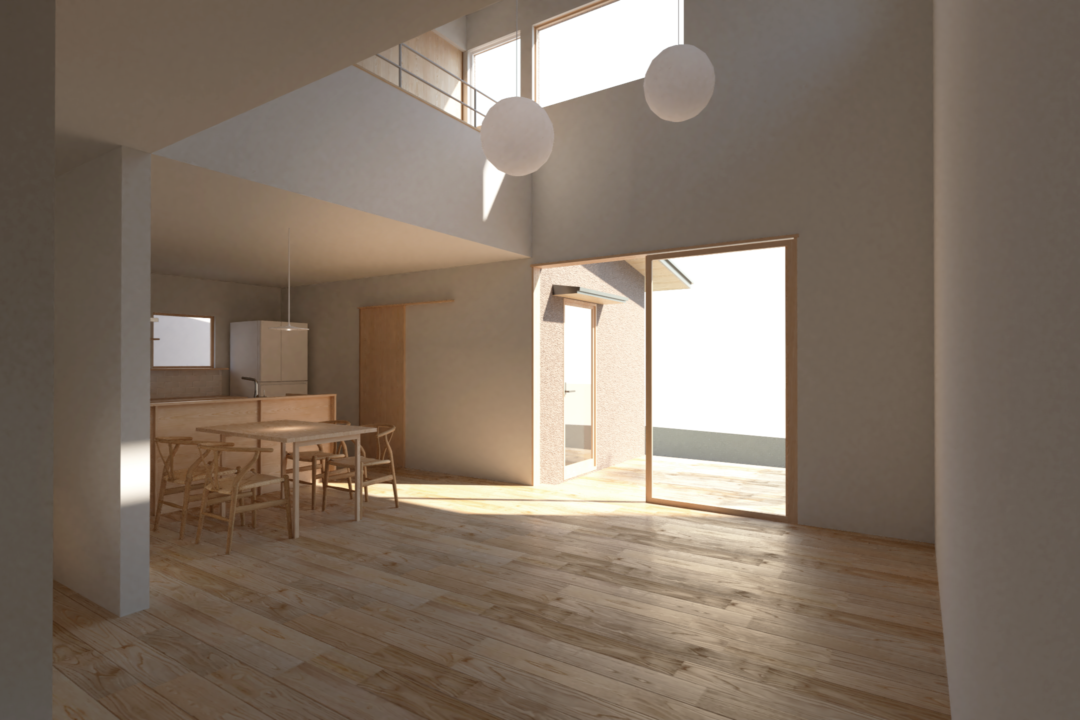 吹き抜けの高窓から差し込むやわらかな朝陽が、静かにリビングを満たす。赤松の床に光が落ち、小上がりの畳には淡い陰影が生まれる。この住まいの一日は、そんな穏やかな光景から始まります。朝はやさしく、昼は明るく、夕方には落ち着いた陰影をつくり出す。その変化は、暮らしのリズムとなり、家族の記憶として積み重なっていきます。